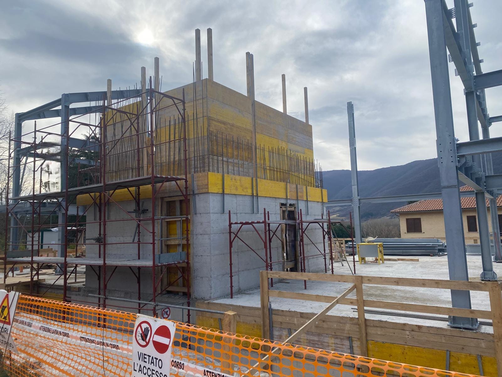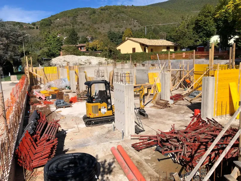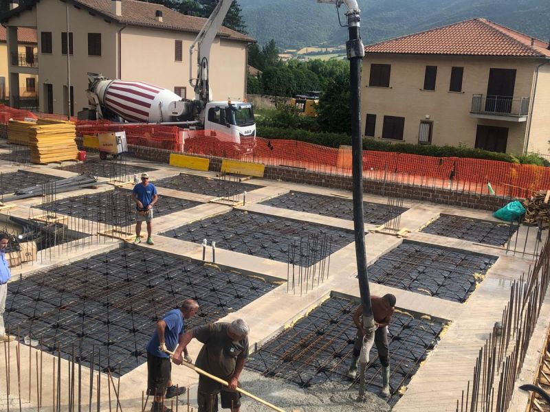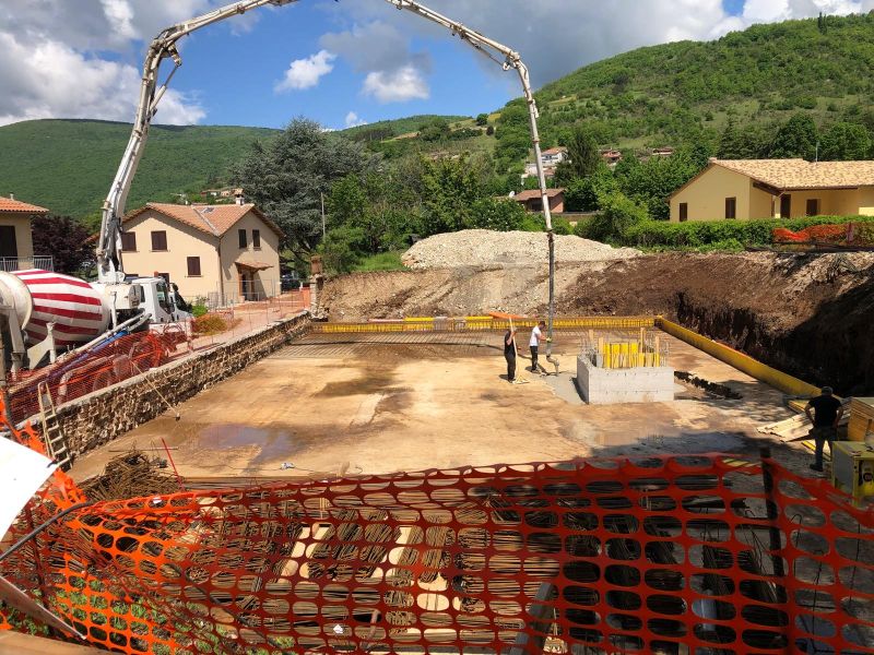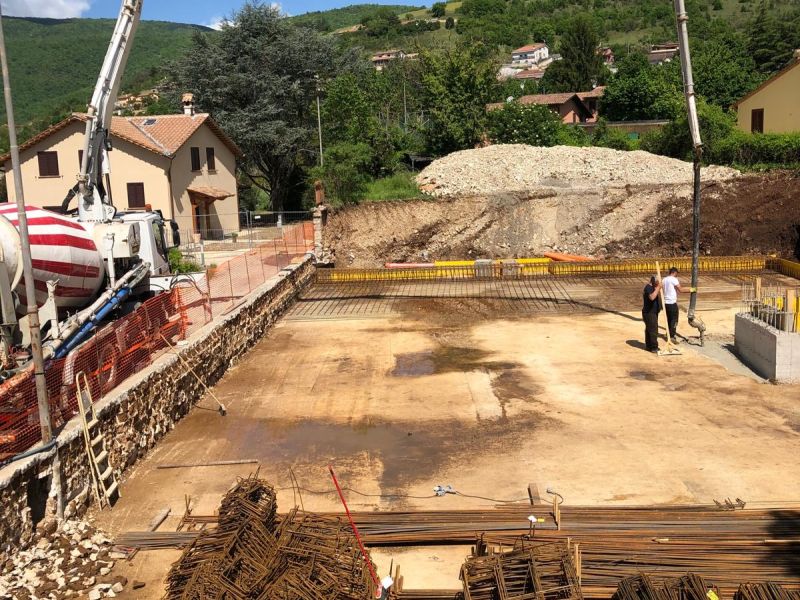 Intervento di demolizione totale con ricostruzione, di un fabbricato composto da n.8 unità immobiliari, sito nella prima fascia fuori la cinta muraria di Norcia. La struttura si compone del blocco interrato e corpo vano scale/vano ascensore in c.a., primo solaio prefabbricato in cemento, mentre i successivi misti acciaio/legno; completa la struttura una elevazione in carpenteria metallica, tamponatura esterna, con la copertura in acciaio/legno