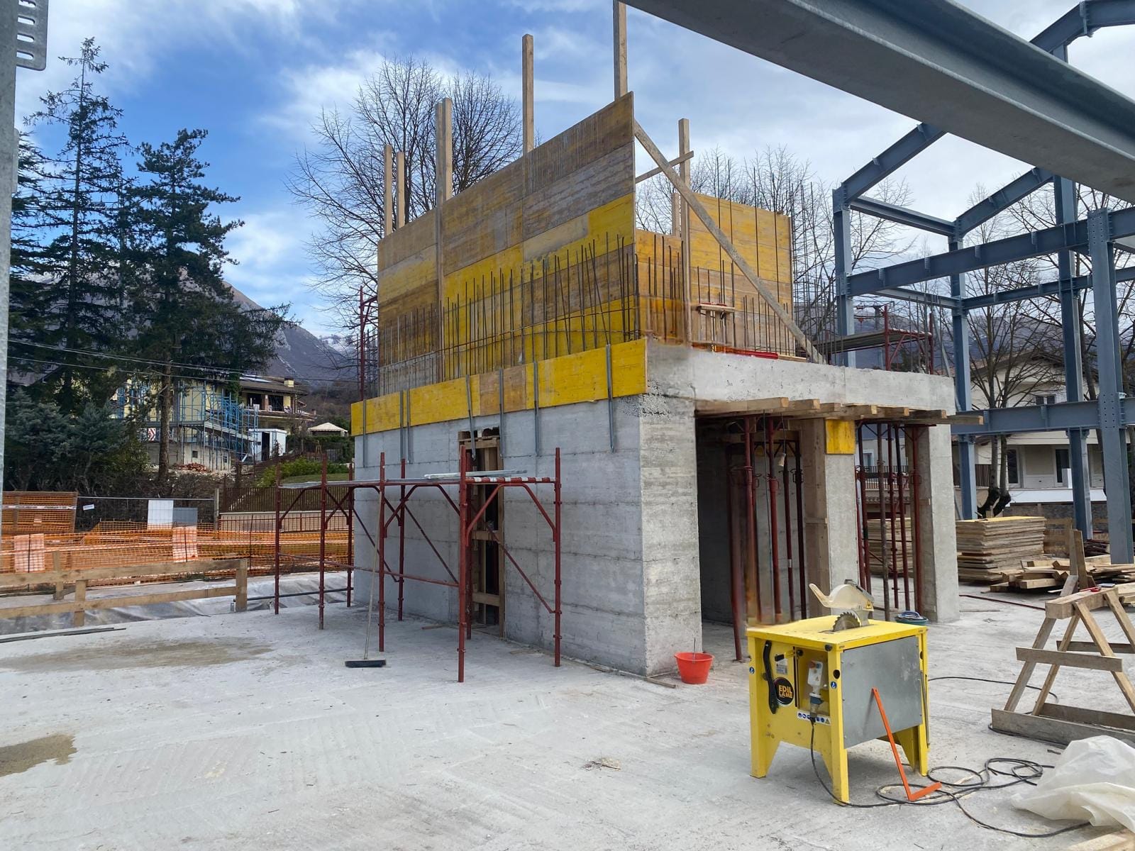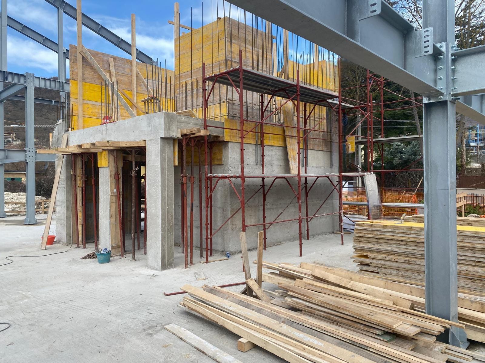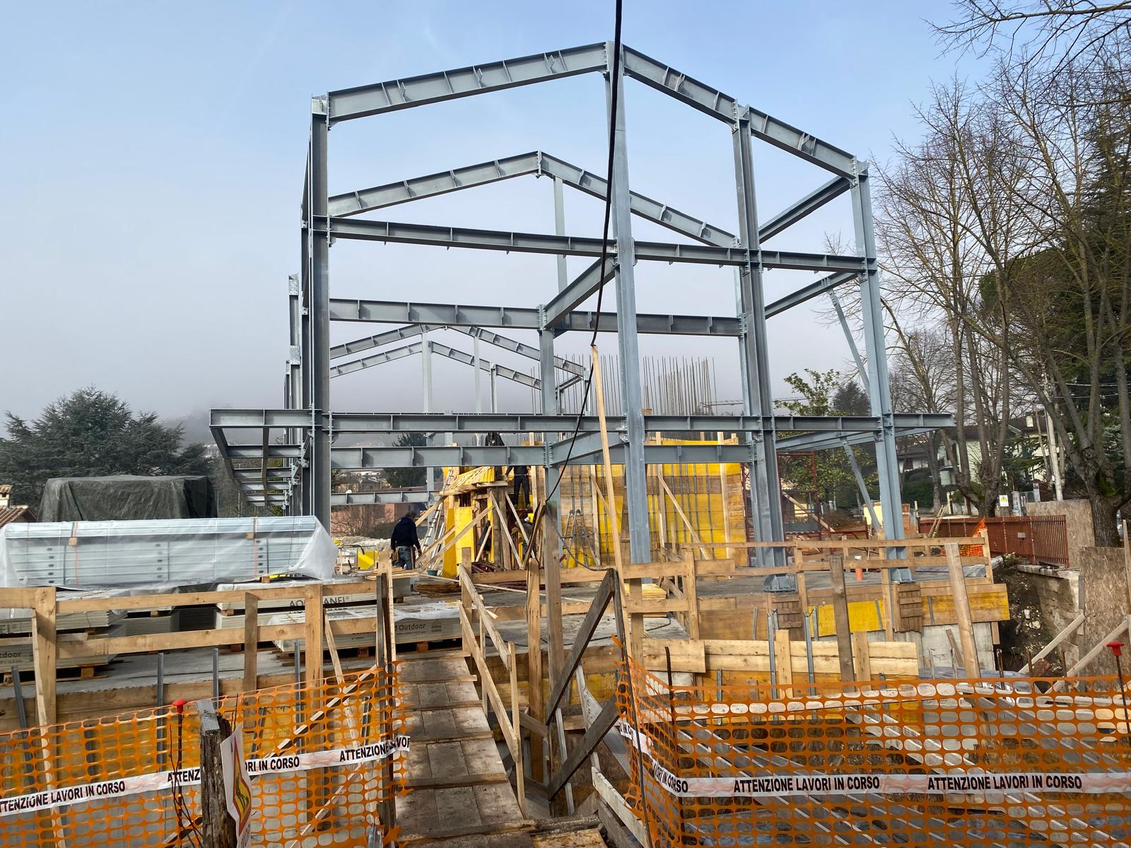 Intervento di demolizione totale con ricostruzione, di un fabbricato composto da n.8 unità immobiliari, sito nella prima fascia fuori la cinta muraria di Norcia. La struttura si compone del blocco interrato e corpo vano scale/vano ascensore in c.a., primo solaio prefabbricato in cemento, mentre i successivi misti acciaio/legno; completa la struttura una elevazione in carpenteria metallica, tamponatura esterna, con la copertura in acciaio/legno
